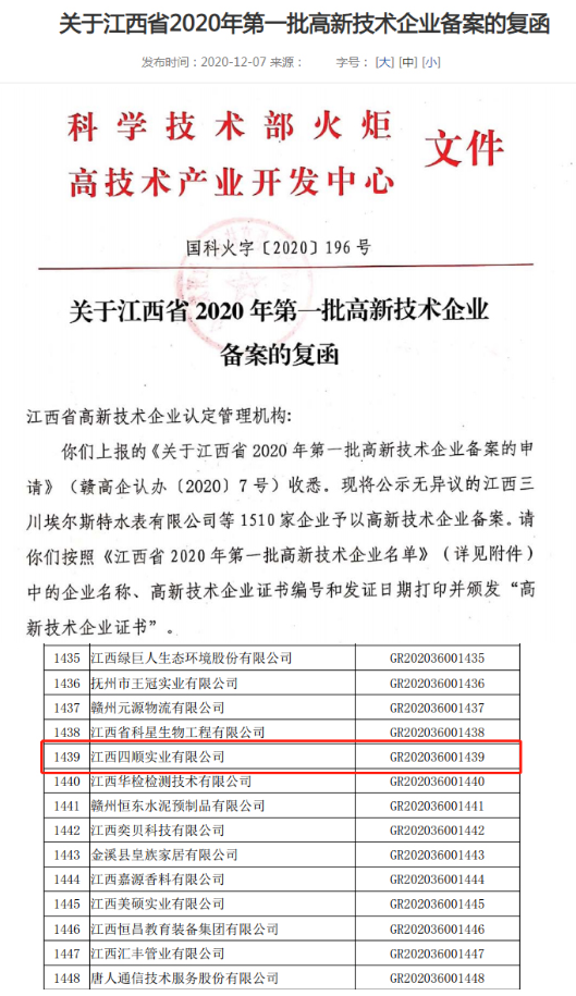 近日,全國高新技術(shù)企業(yè)認(rèn)定管理工作領(lǐng)導(dǎo)小組辦公室對(duì)《江西省2020年第一批高新技術(shù)企業(yè)名單》進(jìn)行批復(fù),江西四順實(shí)業(yè)有限公司成功通過高新技術(shù)企業(yè)認(rèn)定。