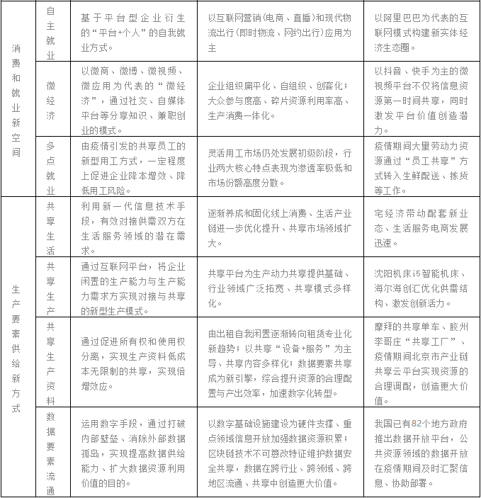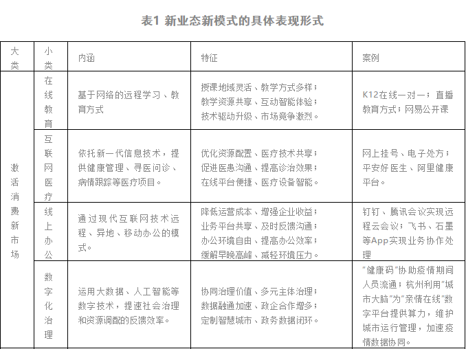 根據(jù)作用方式的不同,我們將新業(yè)態(tài)新模式分為四大類(lèi)15個(gè)小類(lèi)(如表1所示)。其中,在線教育、互聯(lián)網(wǎng)醫(yī)療、線上辦公、數(shù)字化治理等側(cè)重激活消費(fèi)新市場(chǎng);產(chǎn)業(yè)平臺(tái)化、數(shù)字化轉(zhuǎn)型、“虛擬”產(chǎn)業(yè)集群、無(wú)人經(jīng)濟(jì)等為壯大實(shí)體經(jīng)濟(jì)帶來(lái)新動(dòng)能;自主就業(yè)、微經(jīng)濟(jì)、多點(diǎn)執(zhí)業(yè)等側(cè)重開(kāi)辟消費(fèi)就業(yè)新空間;共享生活、共享生產(chǎn)、共享生產(chǎn)資料、數(shù)據(jù)要素流通等側(cè)重創(chuàng)造生產(chǎn)要素供給新方式。?